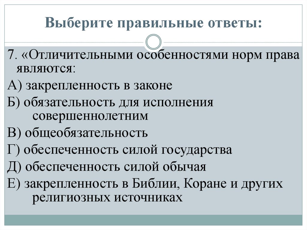 Выберите правильные ответы:7. «Отличительными особенностями норм права