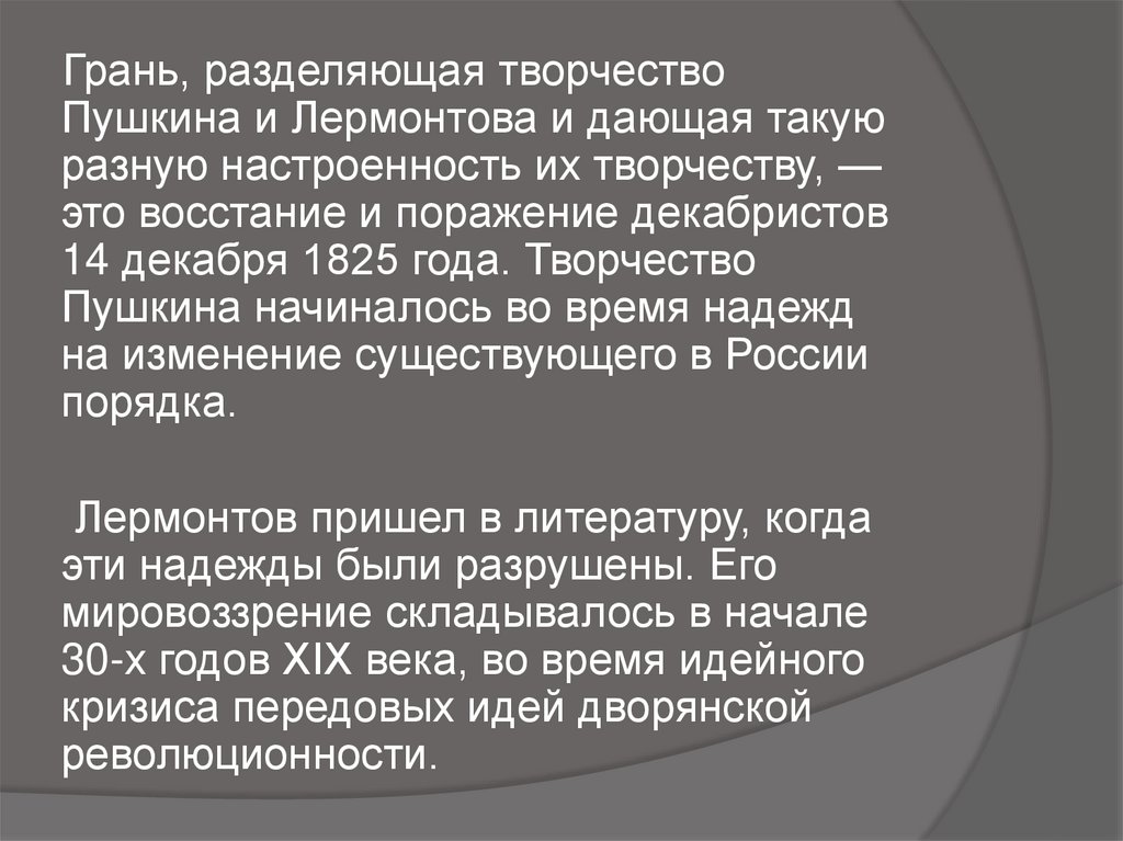 Грань, разделяющая творчествоПушкина и Лермонтова и дающая такую