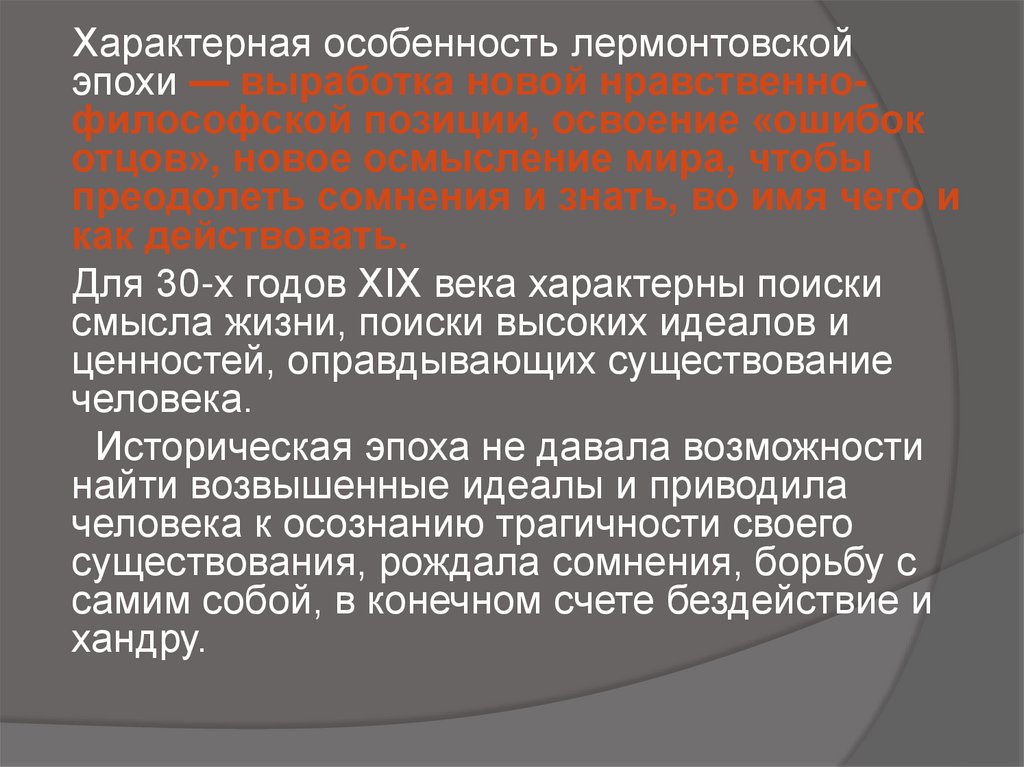 Характерная особенность лермонтовскойэпохи — выработка новой нравственнофилософской позиции, освоение «ошибок