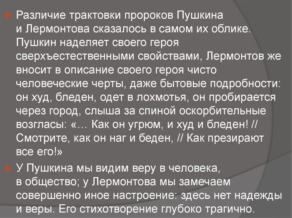 Различие трактовки пророков Пушкинаи Лермонтова сказалось в самом их облике.