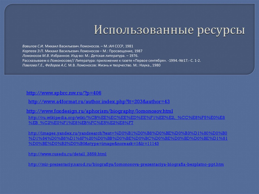 Вавилов С.И. Михаил Васильевич Ломоносов. – М.:АН СССР, 1981Карпеев Э.П. Михаил Васильевич Ломоносов – М.: Просвещение, 1987