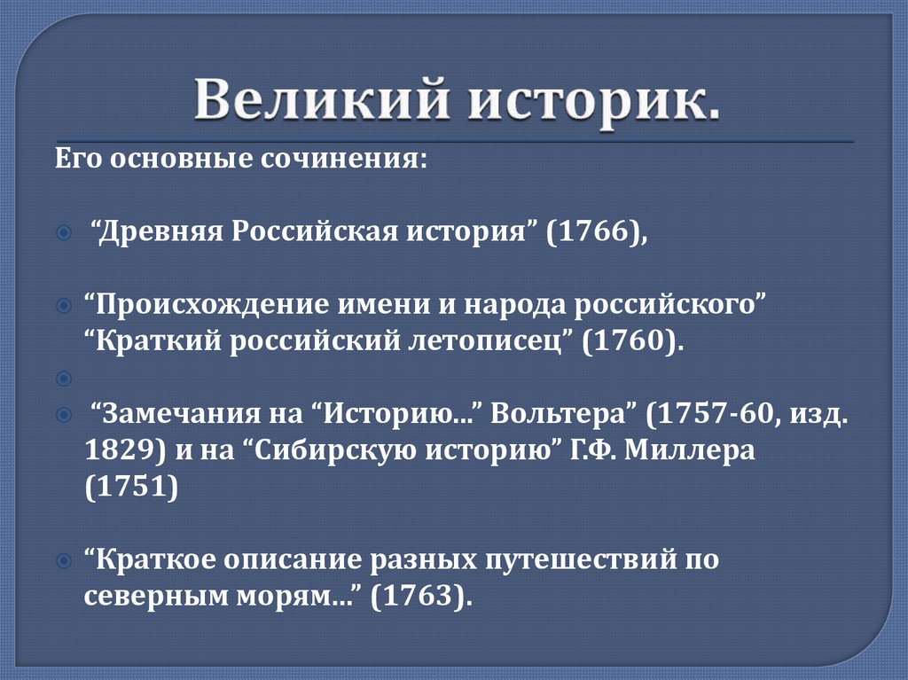 Его основные сочинения:“Древняя Российская история” (1766),