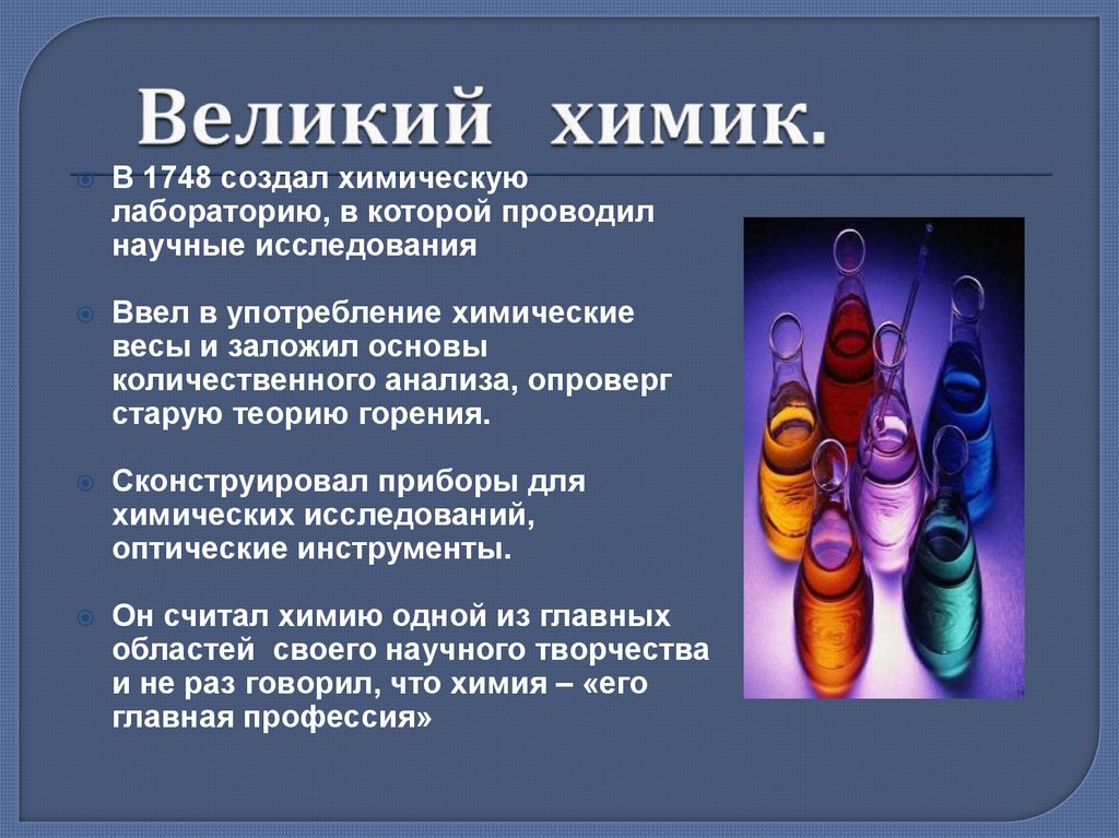 В 1748 создал химическуюлабораторию, в которой проводил