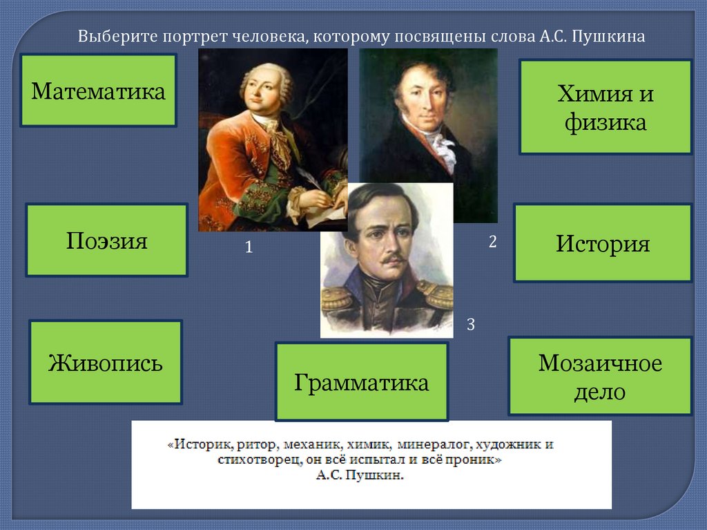 Выберите портрет человека, которому посвящены слова А.С. ПушкинаМатематика