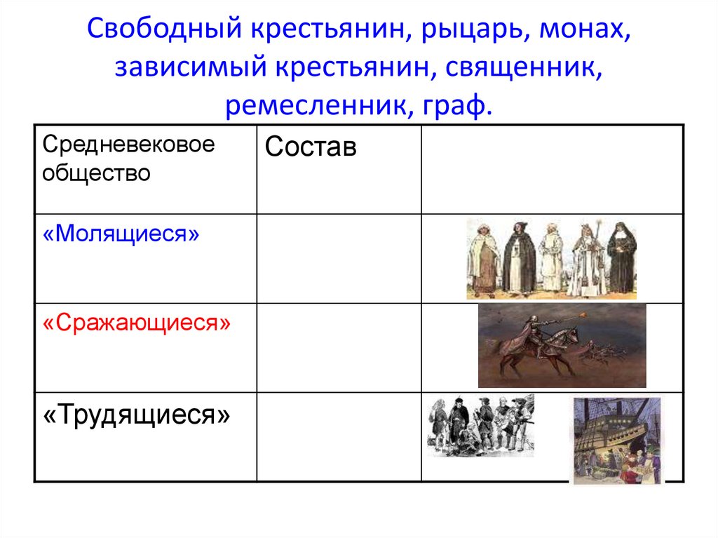 Свободный крестьянин, рыцарь, монах,зависимый крестьянин, священник,