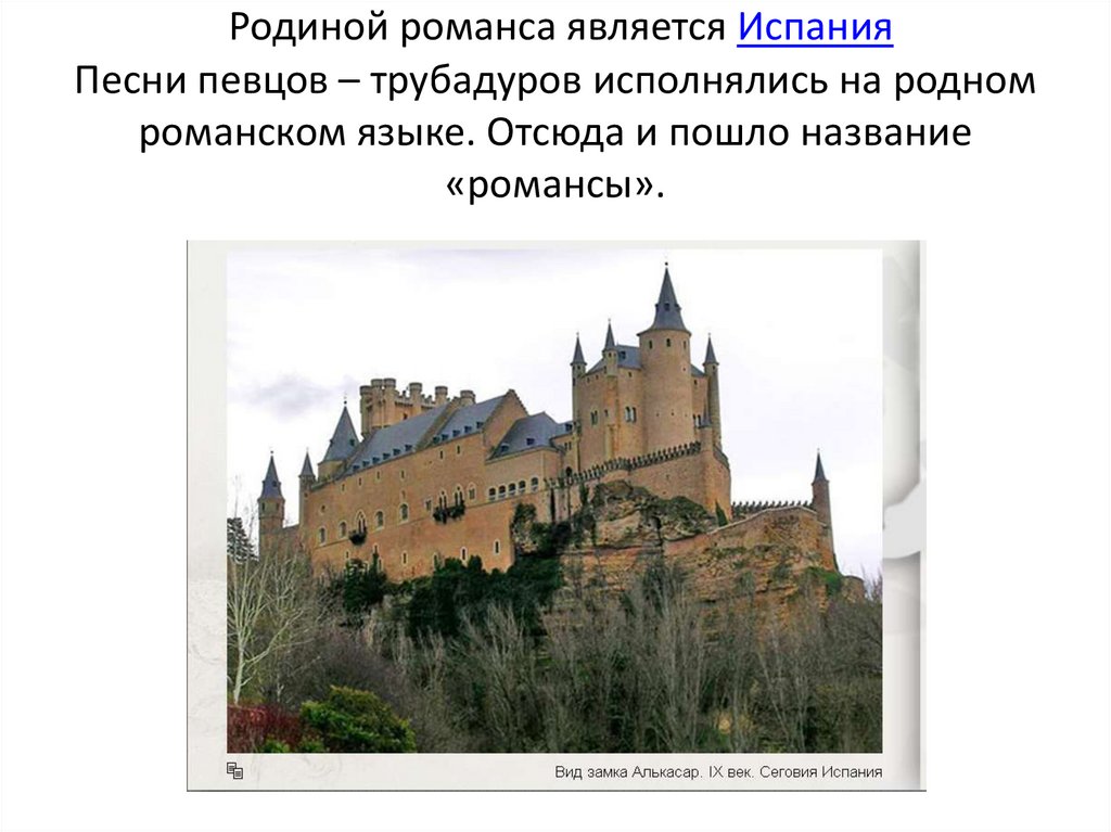 Родиной романса является ИспанияПесни певцов – трубадуров исполнялись на родном