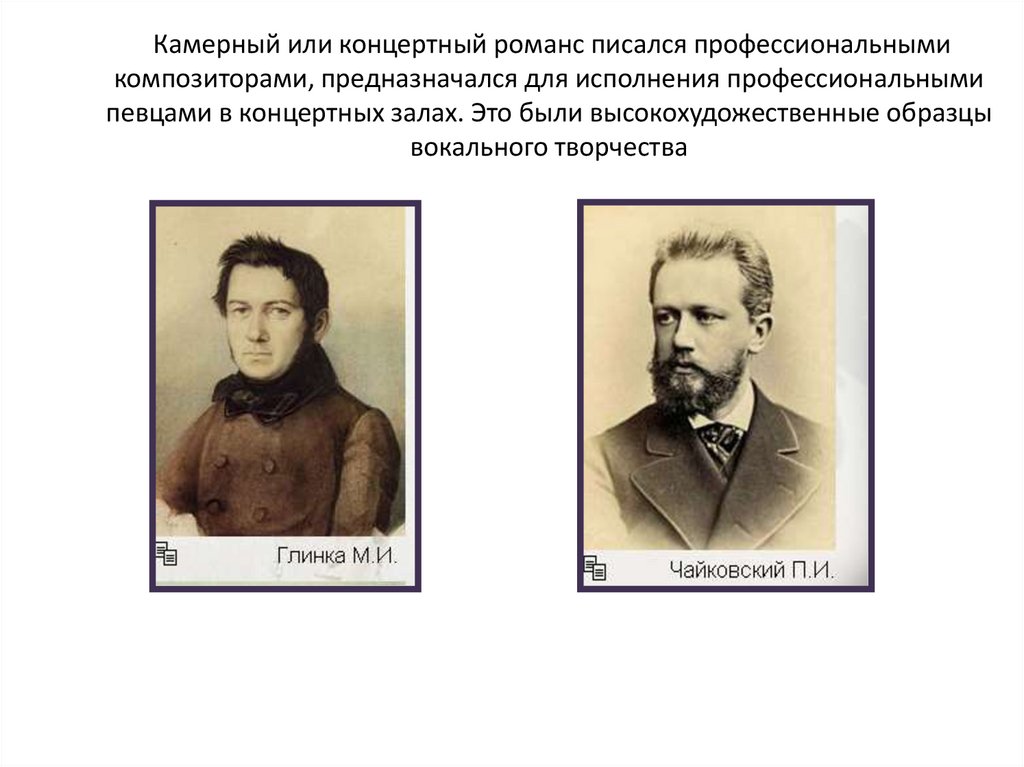 Камерный или концертный романс писался профессиональнымикомпозиторами, предназначался для исполнения профессиональными