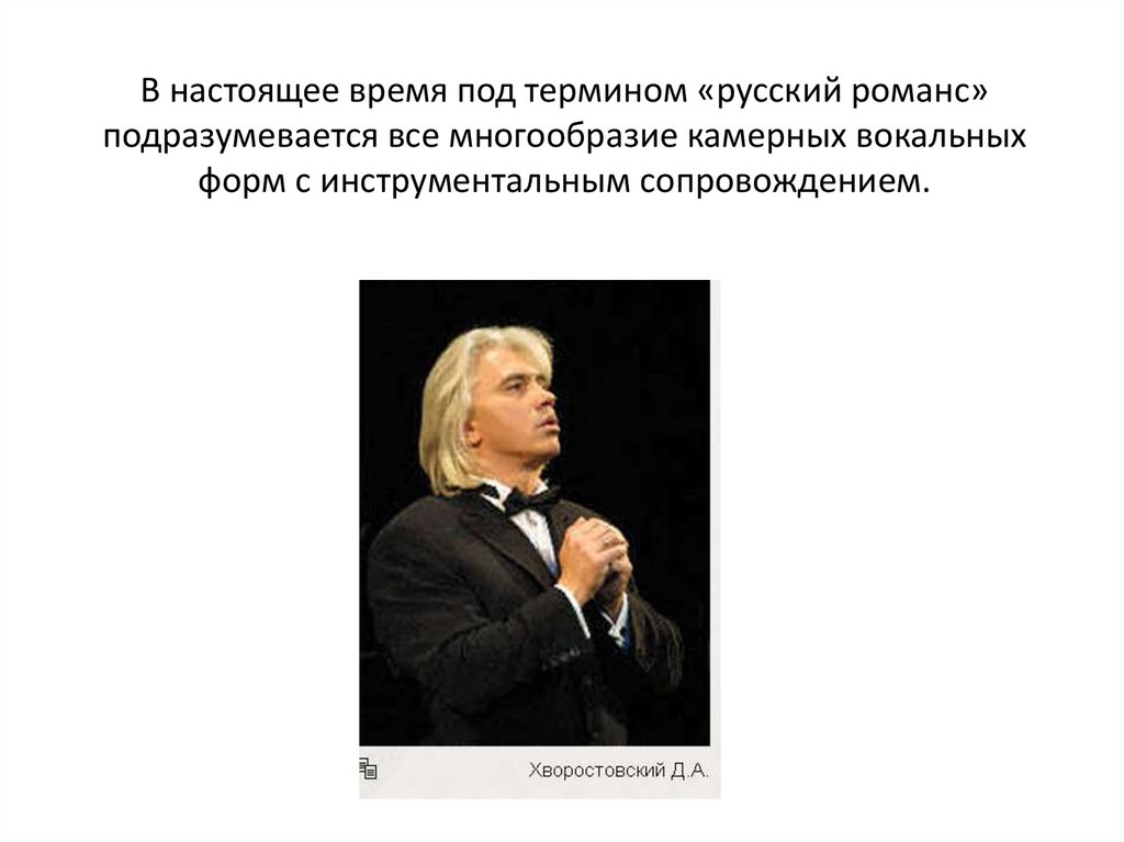 В настоящее время под термином «русский романс»подразумевается все многообразие камерных вокальных