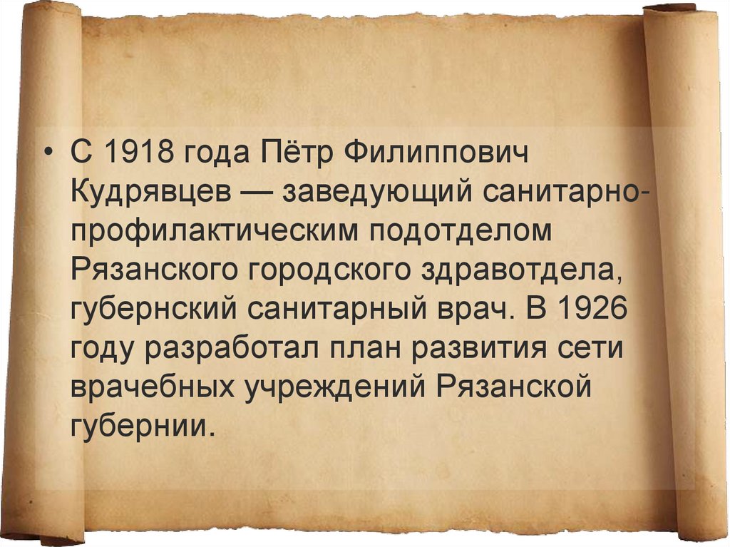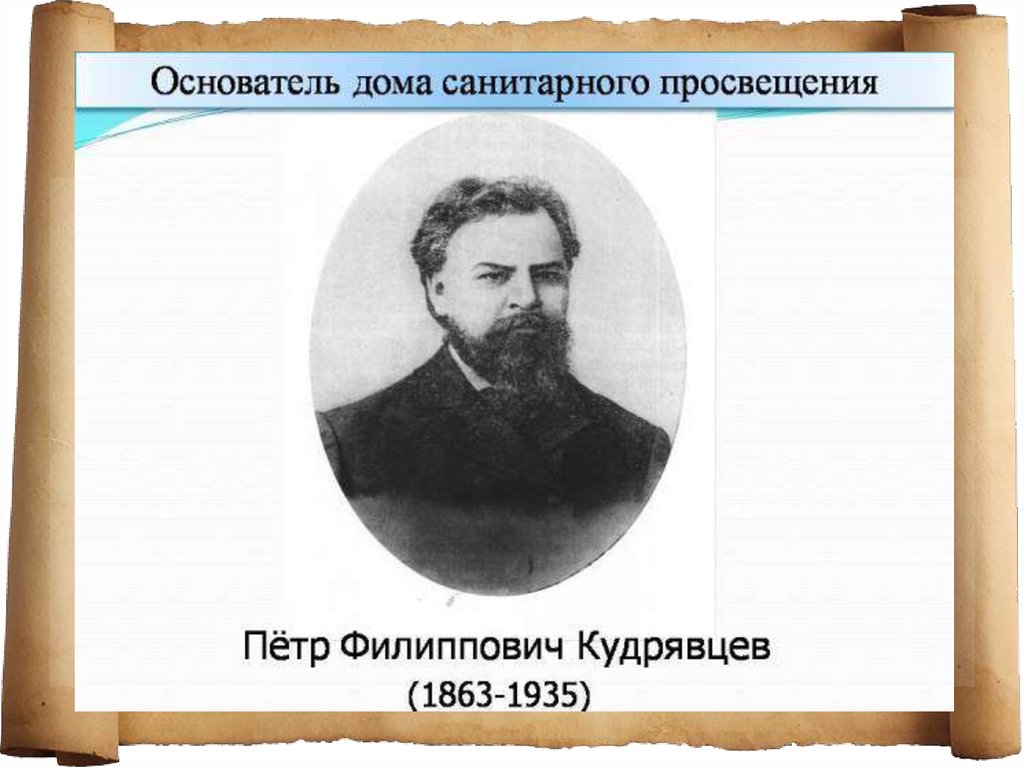 • С 1918 года Пётр ФилипповичКудрявцев — заведующий санитарнопрофилактическим подотделом