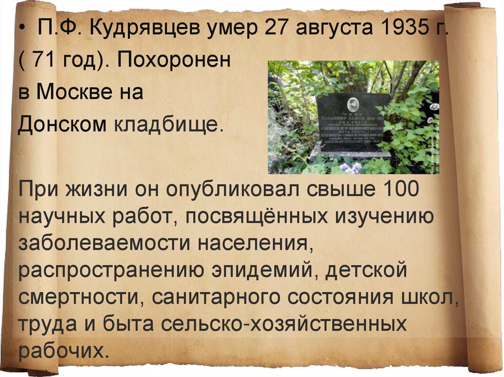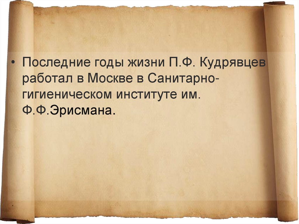 • Последние годы жизни П.Ф. Кудрявцевработал в Москве в Санитарногигиеническом институте им.