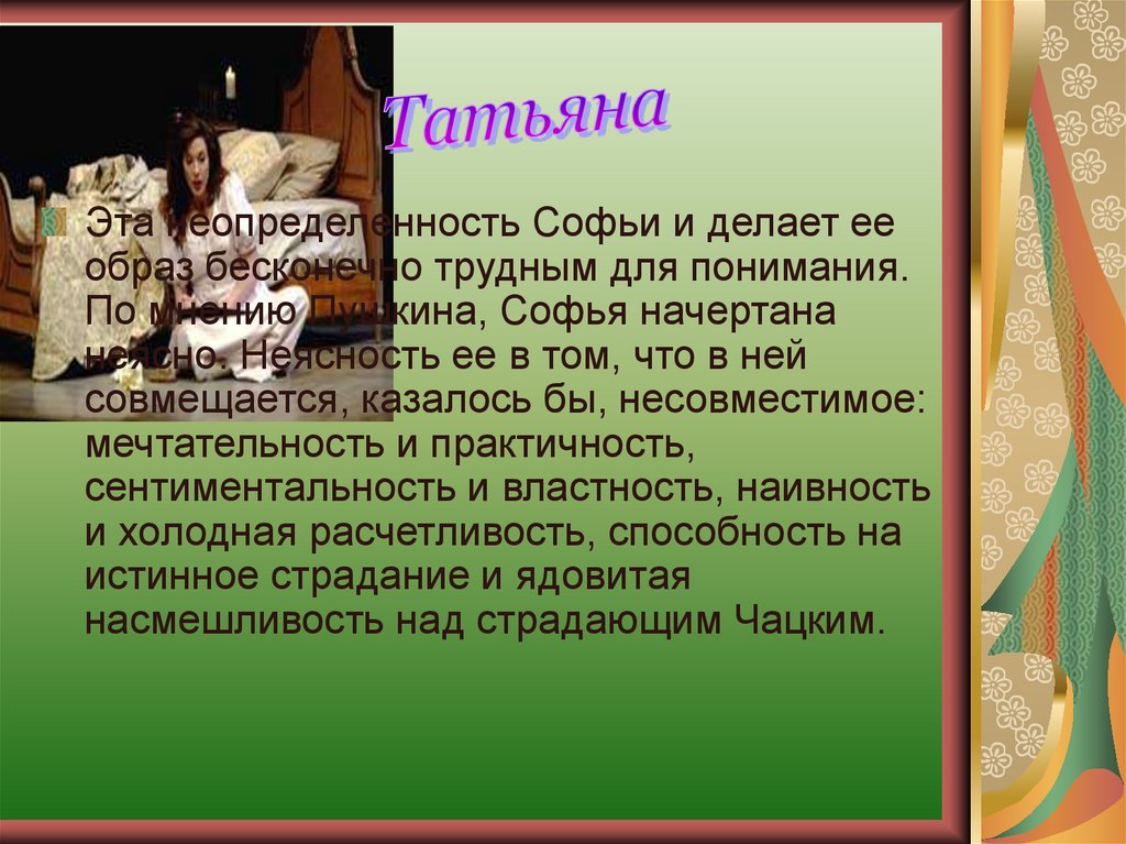 Эта неопределенность Софьи и делает ееобраз бесконечно трудным для понимания.