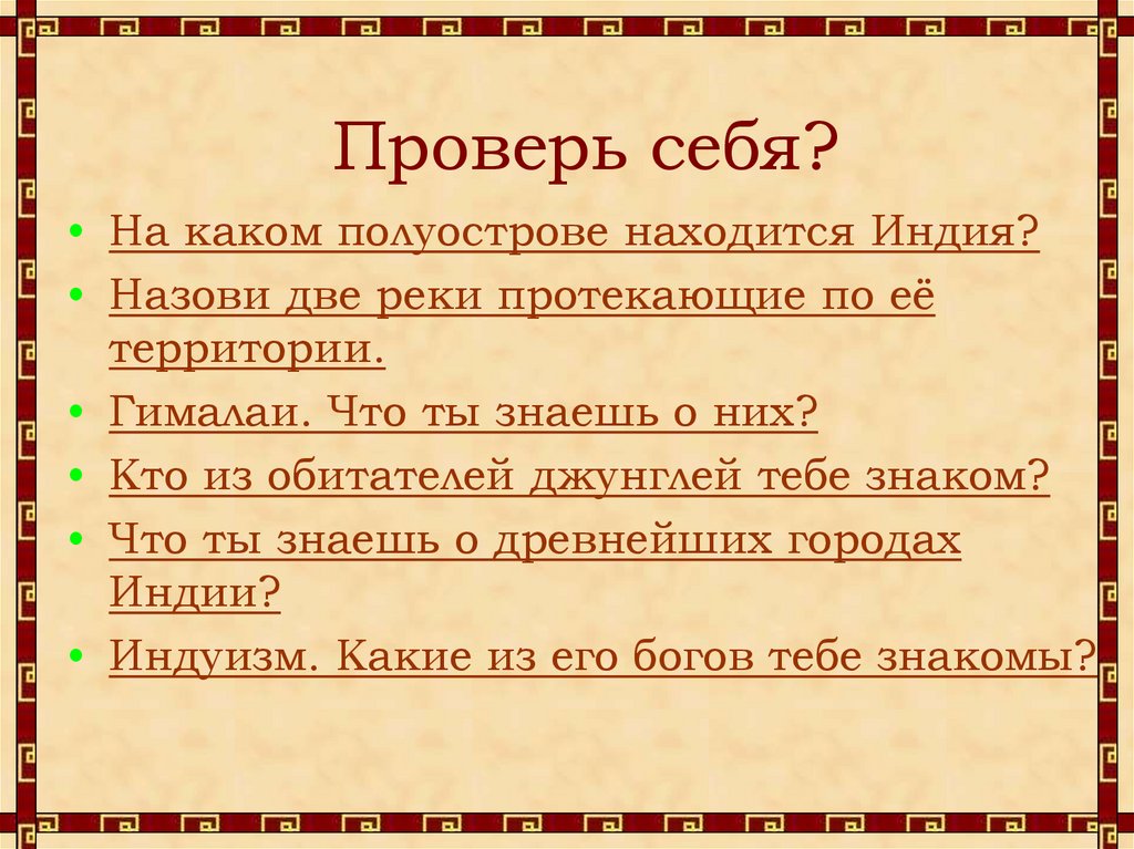 Проверь себя?• На каком полуострове находится Индия?