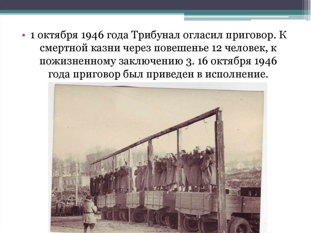 • 1 октября 1946 года Трибунал огласил приговор. Ксмертной казни через повешенье 12 человек, к