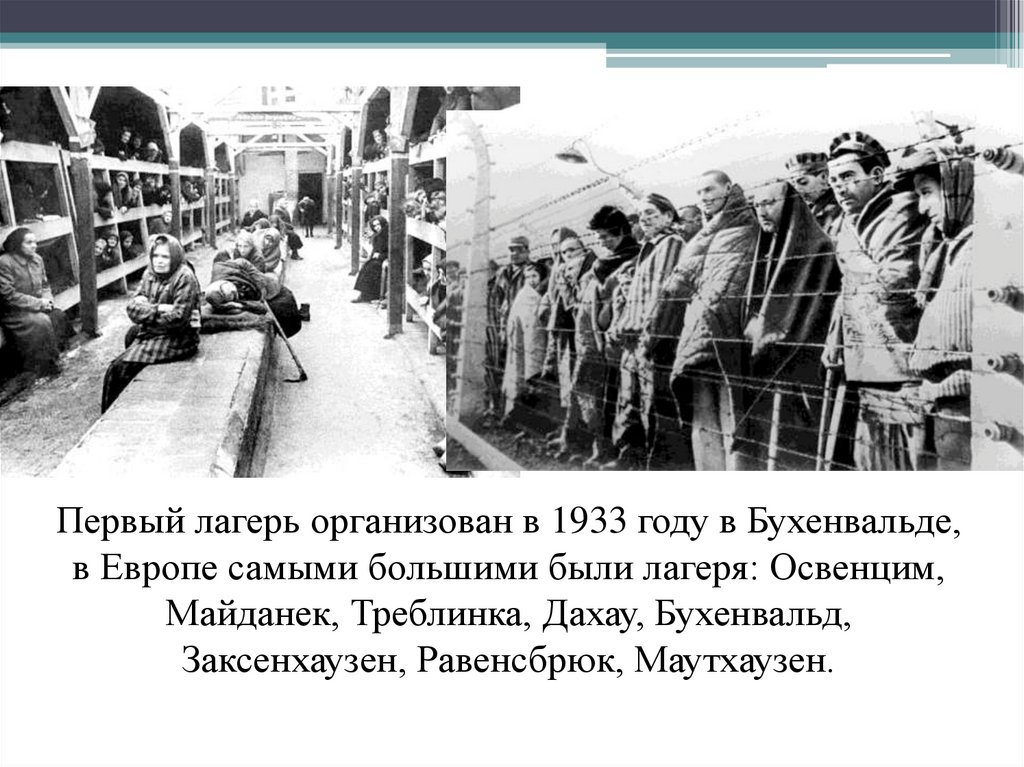 Первый лагерь организован в 1933 году в Бухенвальде,в Европе самыми большими были лагеря: Освенцим,