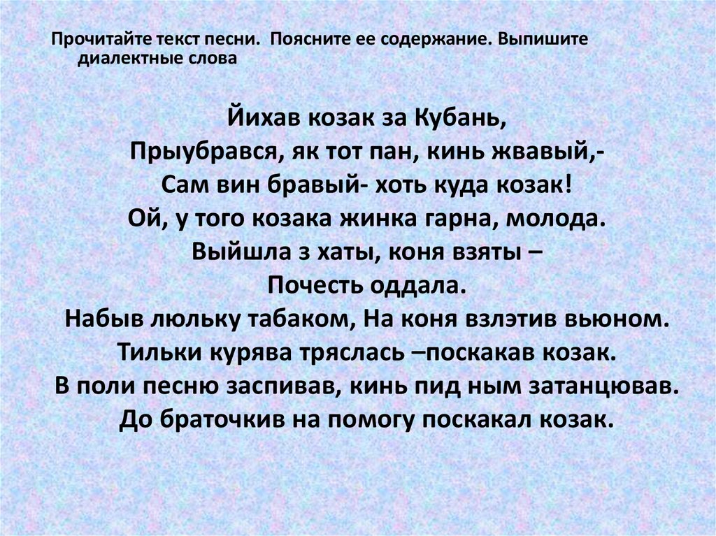 Прочитайте текст песни. Поясните ее содержание. Выпишитедиалектные слова
