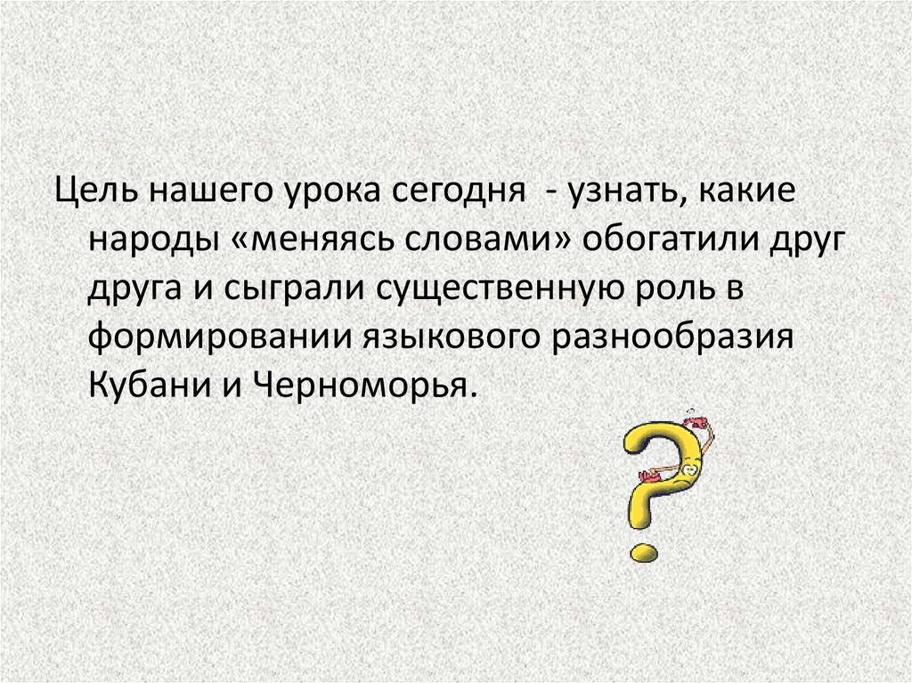 Цель нашего урока сегодня - узнать, какиенароды «меняясь словами» обогатили друг