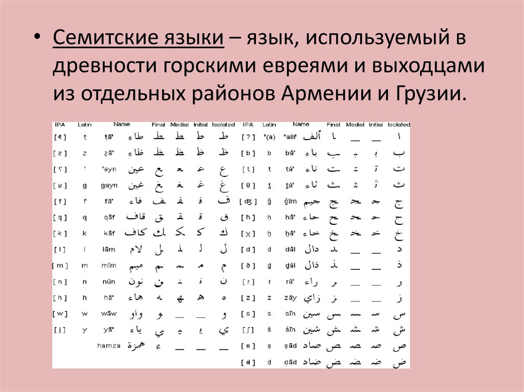• Семитские языки – язык, используемый вдревности горскими евреями и выходцами