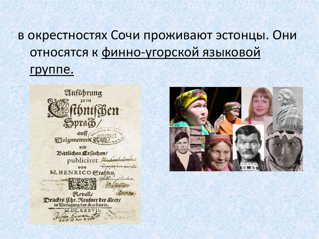 в окрестностях Сочи проживают эстонцы. Ониотносятся к финно-угорской языковой