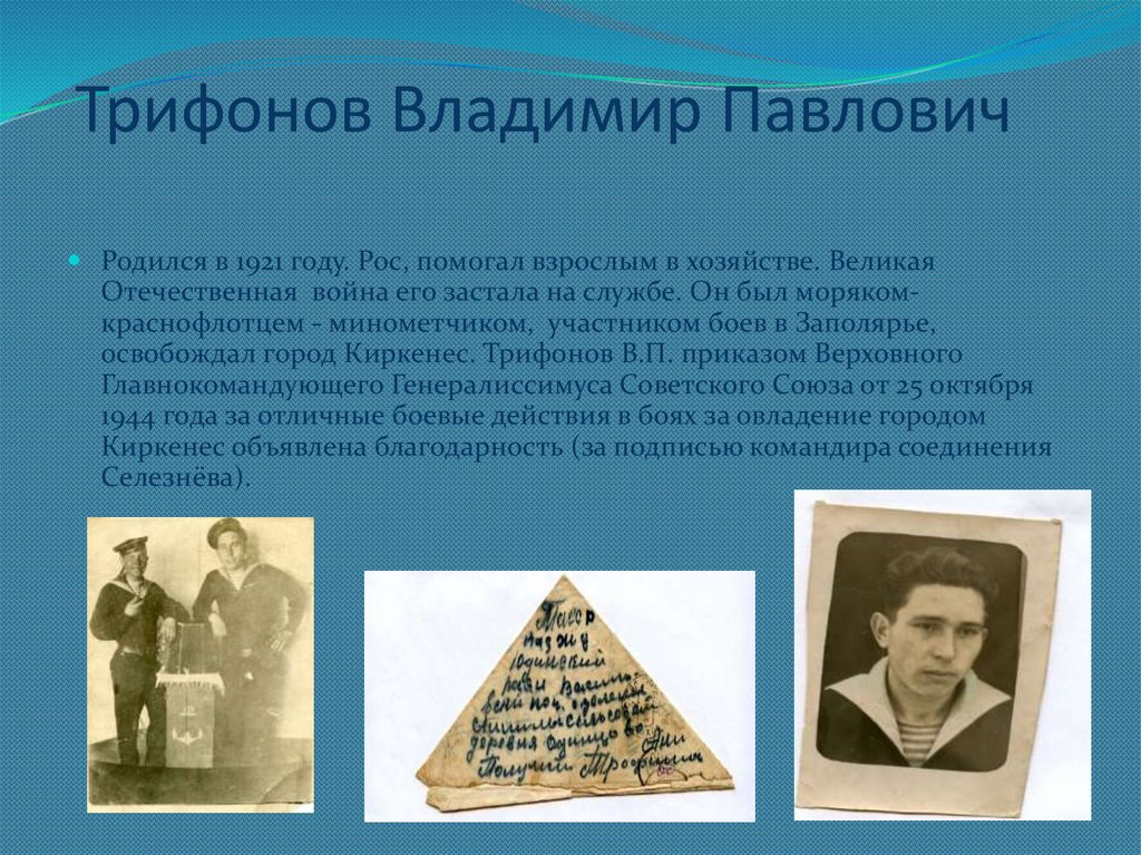 освобождал город Киркенес. Трифонов В.П. приказом Верховного