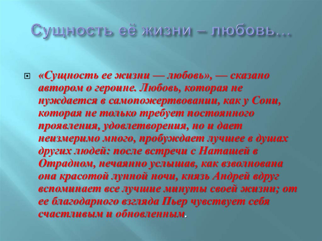 «Сущность ее жизни — любовь», — сказаноавтором о героине. Любовь, которая не