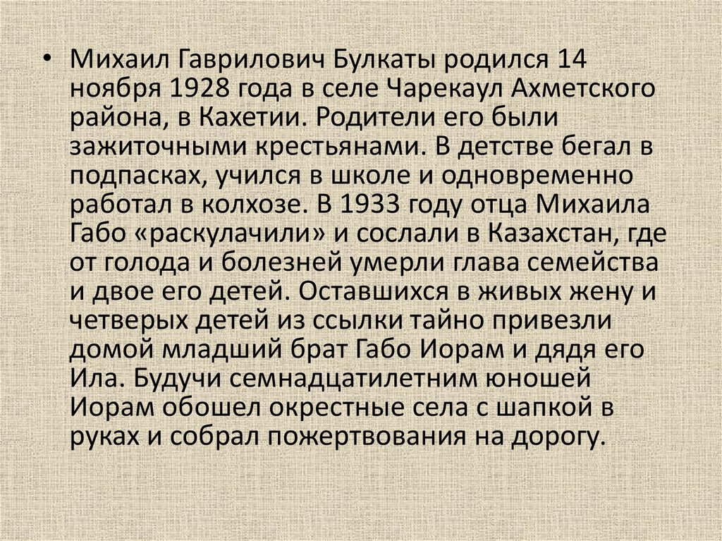 • Михаил Гаврилович Булкаты родился 14ноября 1928 года в селе Чарекаул Ахметского