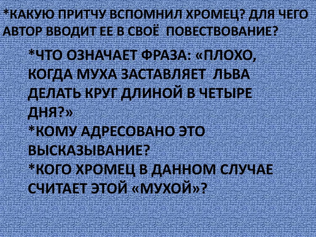 *КАКУЮ ПРИТЧУ ВСПОМНИЛ ХРОМЕЦ? ДЛЯ ЧЕГОАВТОР ВВОДИТ ЕЕ В СВОЁ ПОВЕСТВОВАНИЕ?