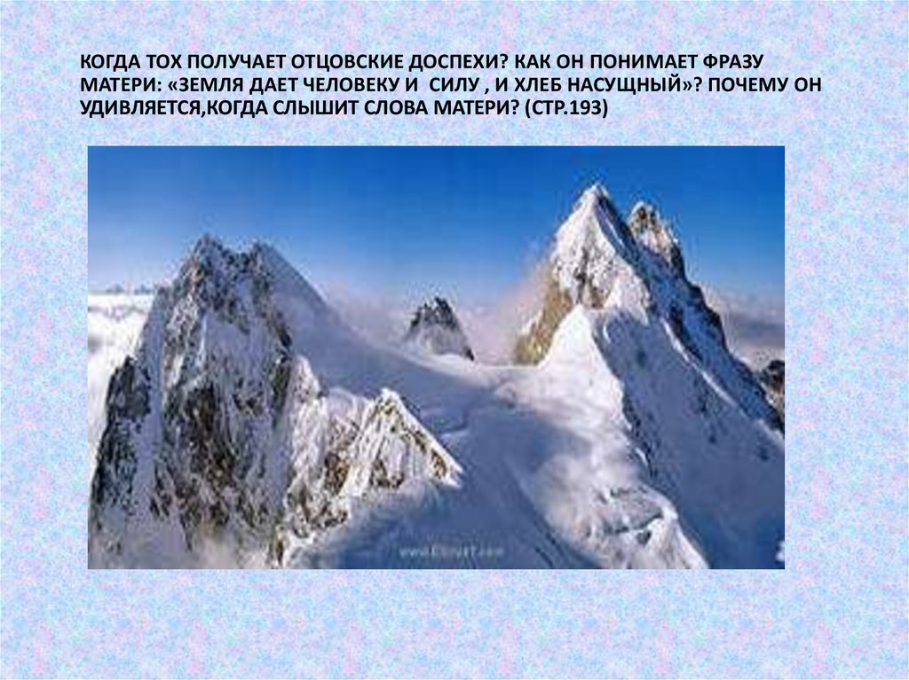 КОГДА ТОХ ПОЛУЧАЕТ ОТЦОВСКИЕ ДОСПЕХИ? КАК ОН ПОНИМАЕТ ФРАЗУМАТЕРИ: «ЗЕМЛЯ ДАЕТ ЧЕЛОВЕКУ И СИЛУ , И ХЛЕБ НАСУЩНЫЙ»? ПОЧЕМУ ОН