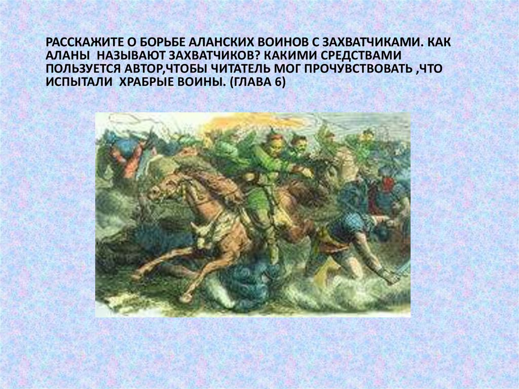 РАССКАЖИТЕ О БОРЬБЕ АЛАНСКИХ ВОИНОВ С ЗАХВАТЧИКАМИ. КАКАЛАНЫ НАЗЫВАЮТ ЗАХВАТЧИКОВ? КАКИМИ СРЕДСТВАМИ