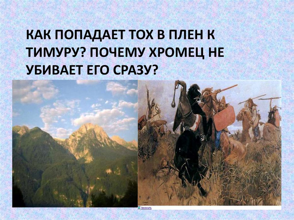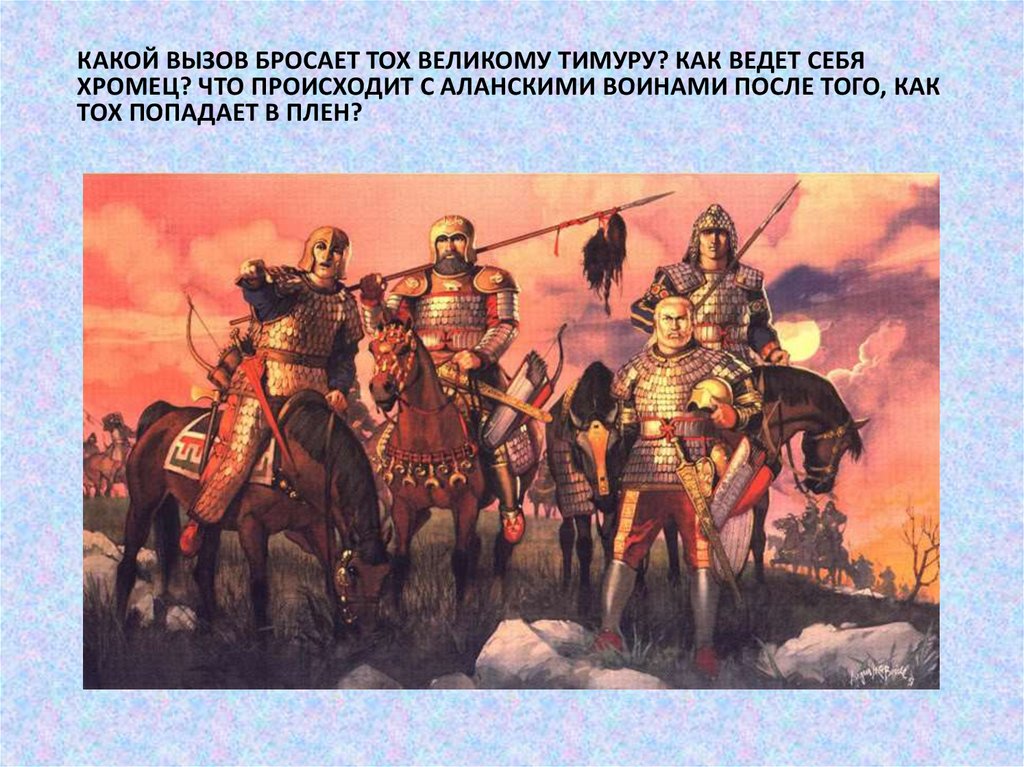 КАКОЙ ВЫЗОВ БРОСАЕТ ТОХ ВЕЛИКОМУ ТИМУРУ? КАК ВЕДЕТ СЕБЯХРОМЕЦ? ЧТО ПРОИСХОДИТ С АЛАНСКИМИ ВОИНАМИ ПОСЛЕ ТОГО, КАК