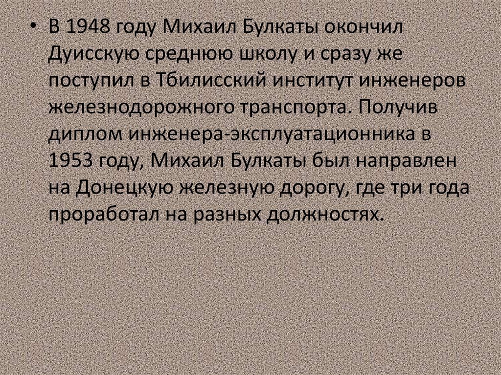 • В 1948 году Михаил Булкаты окончилДуисскую среднюю школу и сразу же