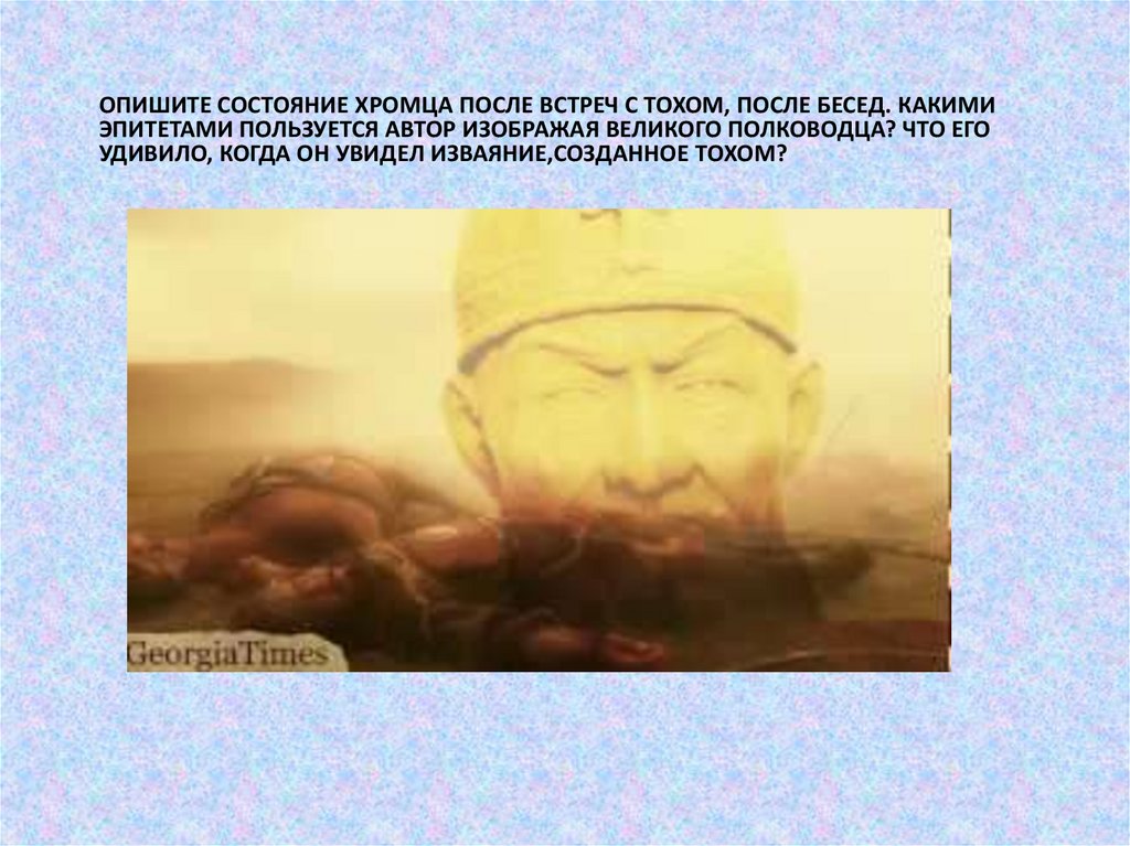 ОПИШИТЕ СОСТОЯНИЕ ХРОМЦА ПОСЛЕ ВСТРЕЧ С ТОХОМ, ПОСЛЕ БЕСЕД. КАКИМИЭПИТЕТАМИ ПОЛЬЗУЕТСЯ АВТОР ИЗОБРАЖАЯ ВЕЛИКОГО ПОЛКОВОДЦА? ЧТО ЕГО