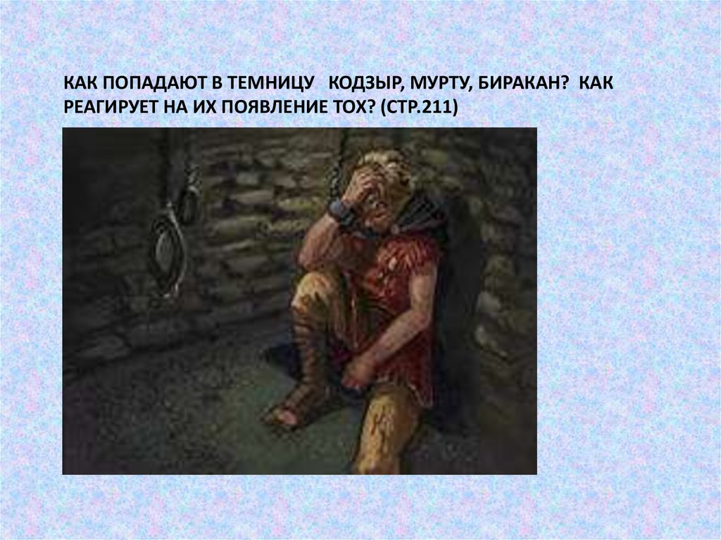 КАК ПОПАДАЮТ В ТЕМНИЦУ КОДЗЫР, МУРТУ, БИРАКАН? КАКРЕАГИРУЕТ НА ИХ ПОЯВЛЕНИЕ ТОХ? (СТР.211)