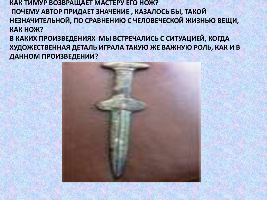 КАК ТИМУР ВОЗВРАЩАЕТ МАСТЕРУ ЕГО НОЖ?ПОЧЕМУ АВТОР ПРИДАЕТ ЗНАЧЕНИЕ , КАЗАЛОСЬ БЫ, ТАКОЙ