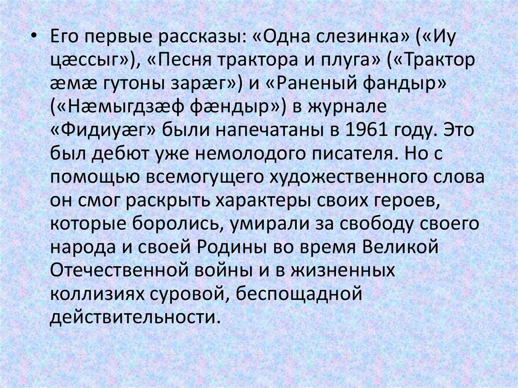 • Его первые рассказы: «Одна слезинка» («Иуцæссыг»), «Песня трактора и плуга» («Трактор
