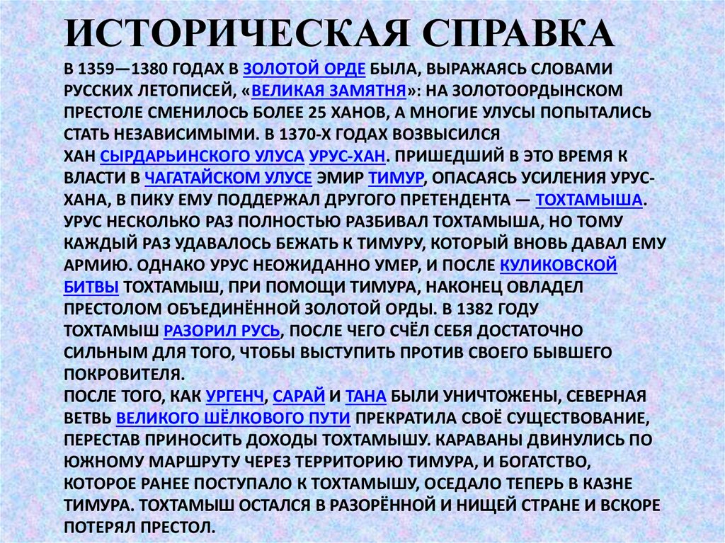 ИСТОРИЧЕСКАЯ СПРАВКАВ 1359—1380 ГОДАХ В ЗОЛОТОЙ ОРДЕ БЫЛА, ВЫРАЖАЯСЬ СЛОВАМИ