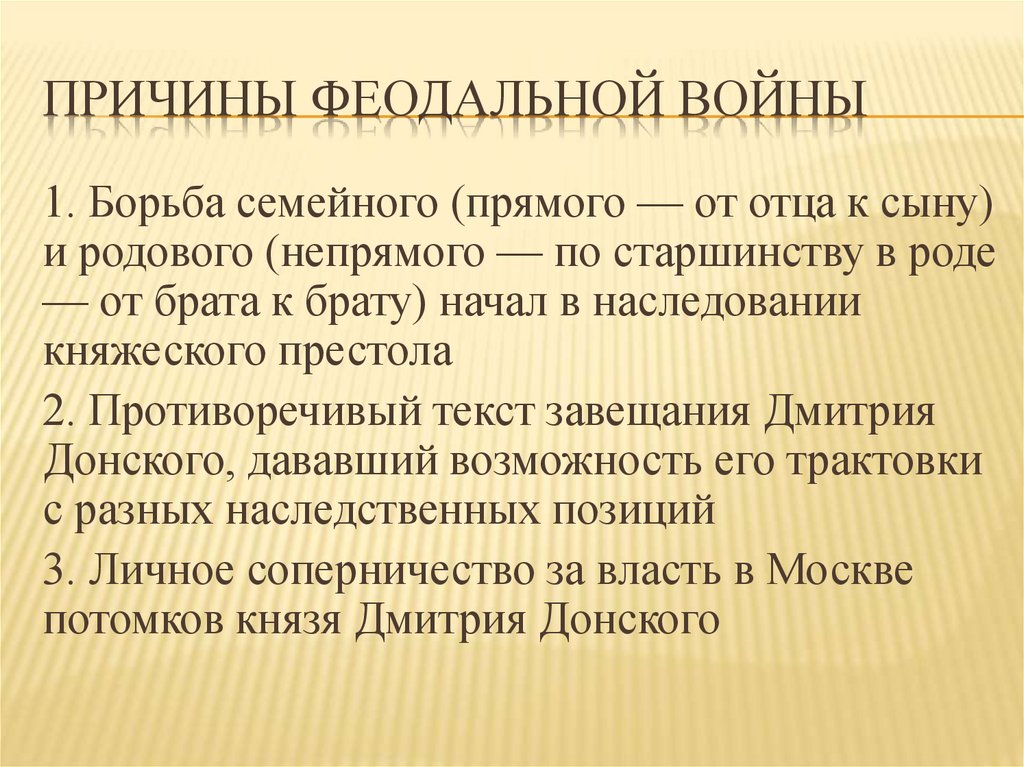 ПРИЧИНЫ ФЕОДАЛЬНОЙ ВОЙНЫ1. Борьба семейного (прямого — от отца к сыну)
