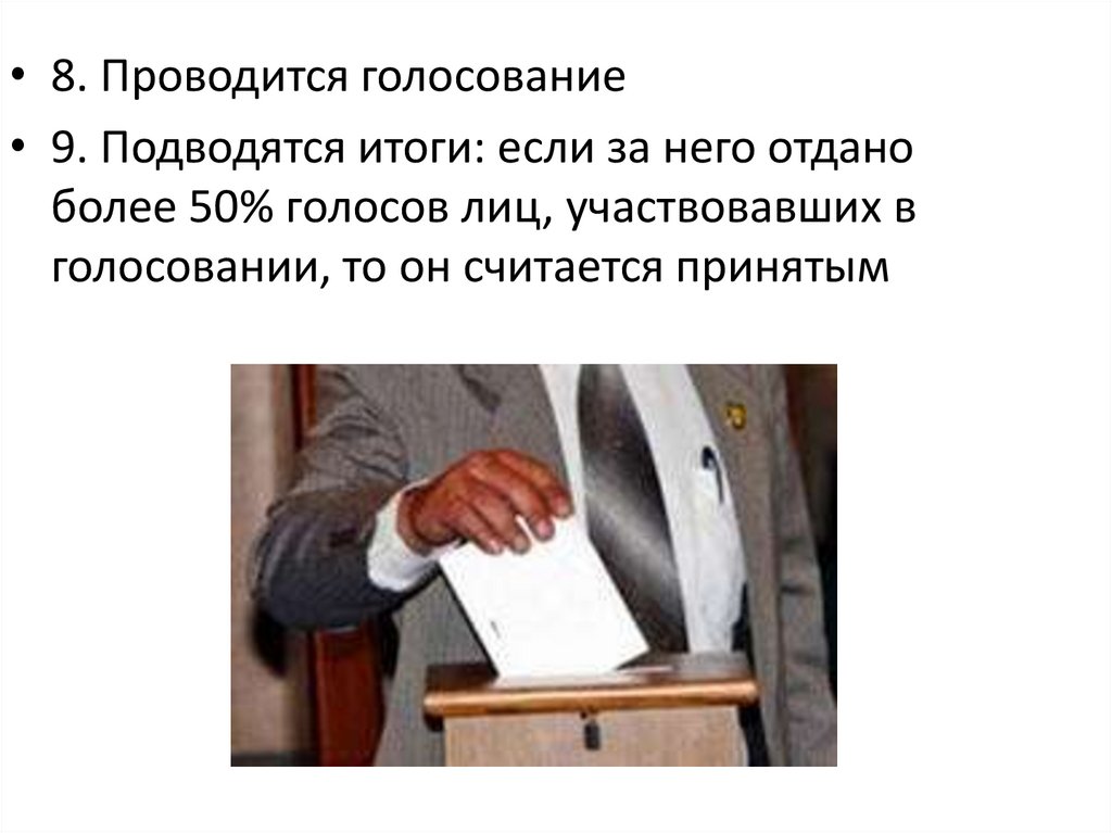 • 8. Проводится голосование• 9. Подводятся итоги: если за него отдано