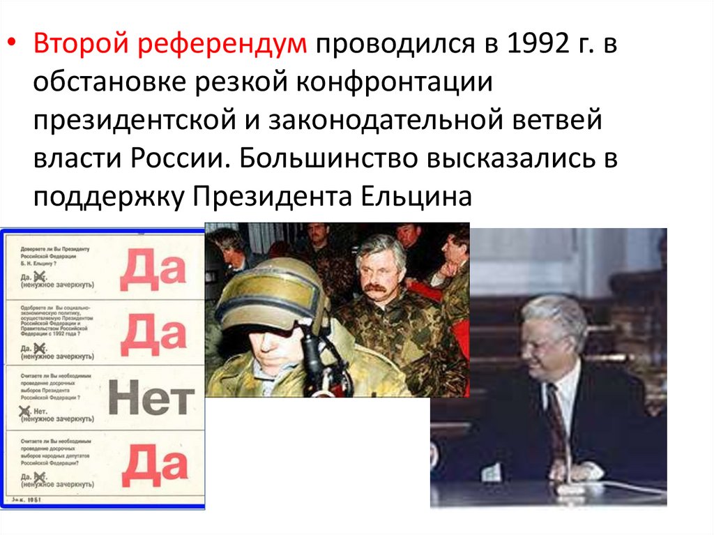 • Второй референдум проводился в 1992 г. вобстановке резкой конфронтации