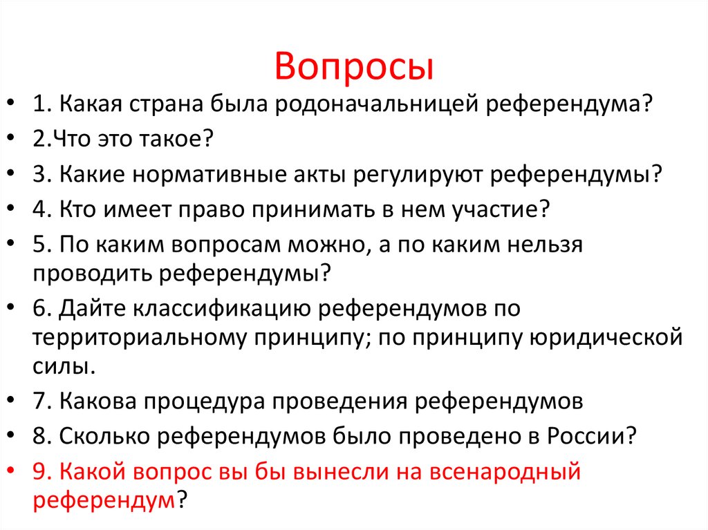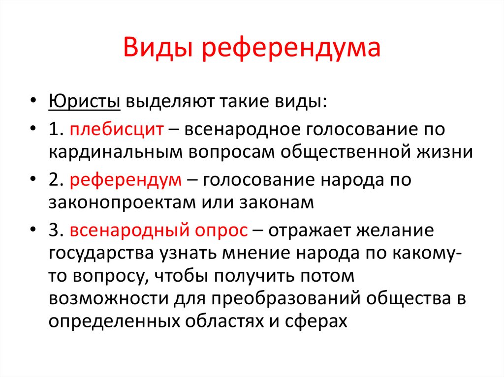 • Ученые-политологи все названные видыназывают референдумом и классифицируют их