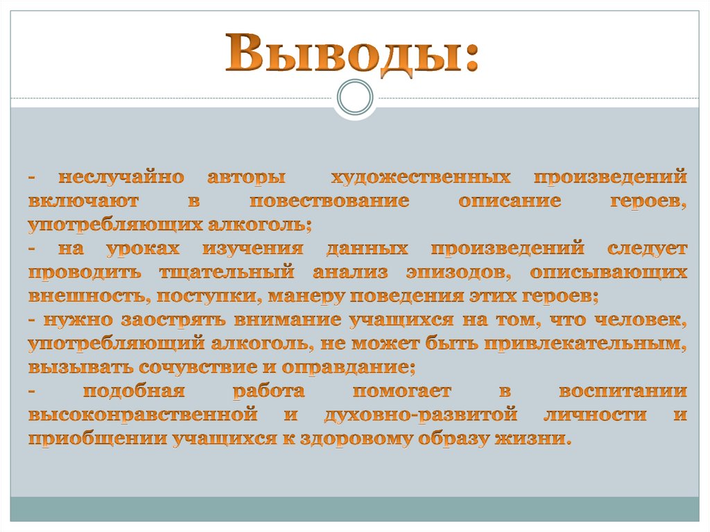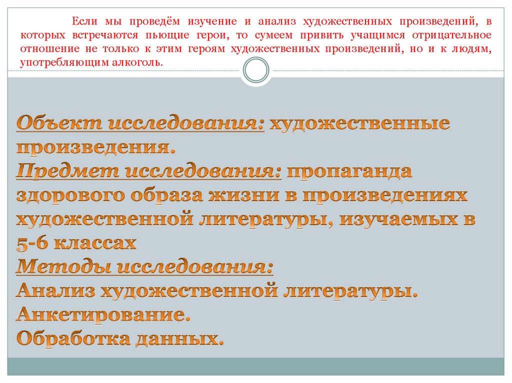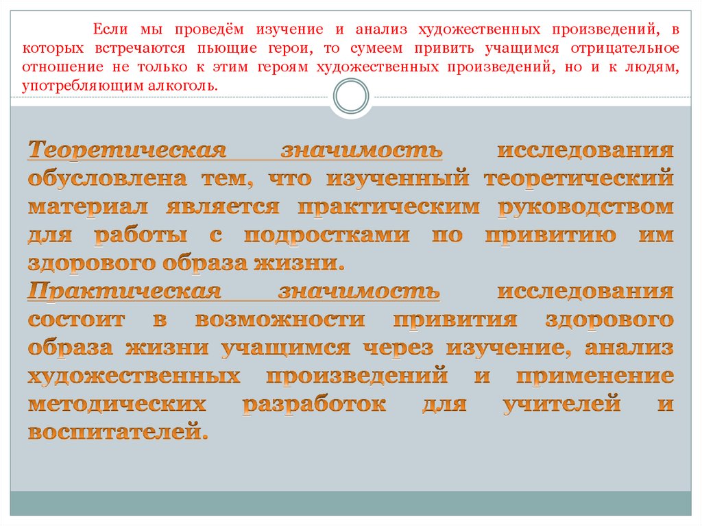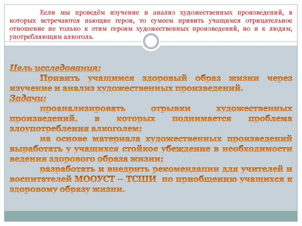 Если мы проведём изучение и анализ художественных произведений, вкоторых встречаются пьющие герои, то сумеем привить учащимся отрицательное