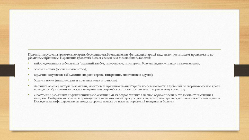 Причины нарушения кровотока во время беременности.Возникновение фетоплацентарной недостаточности может происходить поразличным причинам. Нарушение кровотока бывает следствием следующих патологий: