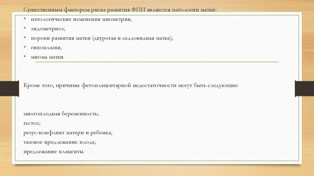 Существенным фактором риска развития ФПН являются патологии матки:патологические изменения миометрия;