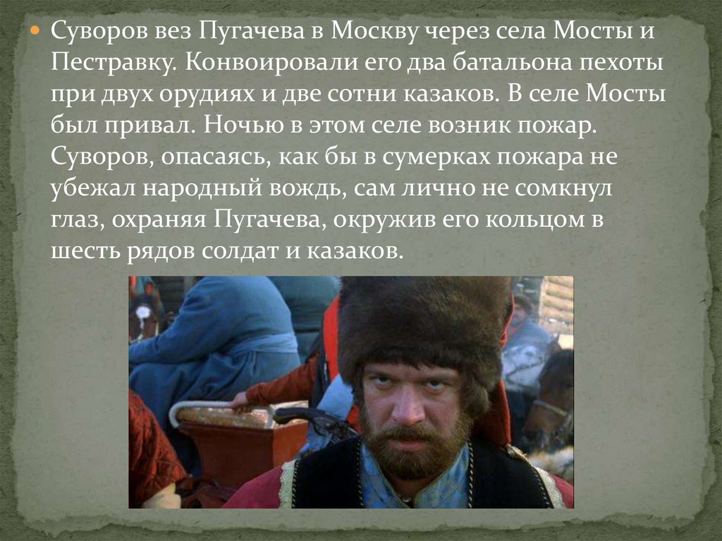 Суворов вез Пугачева в Москву через села Мосты иПестравку. Конвоировали его два батальона пехоты