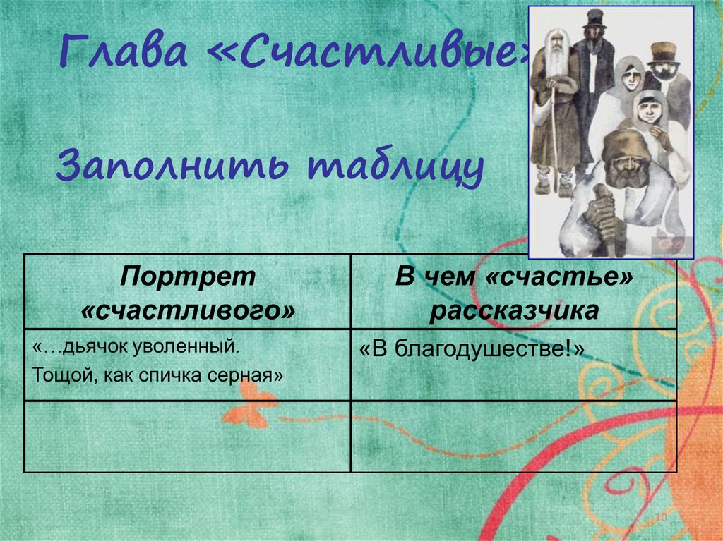 Глава «Счастливые»Заполнить таблицу