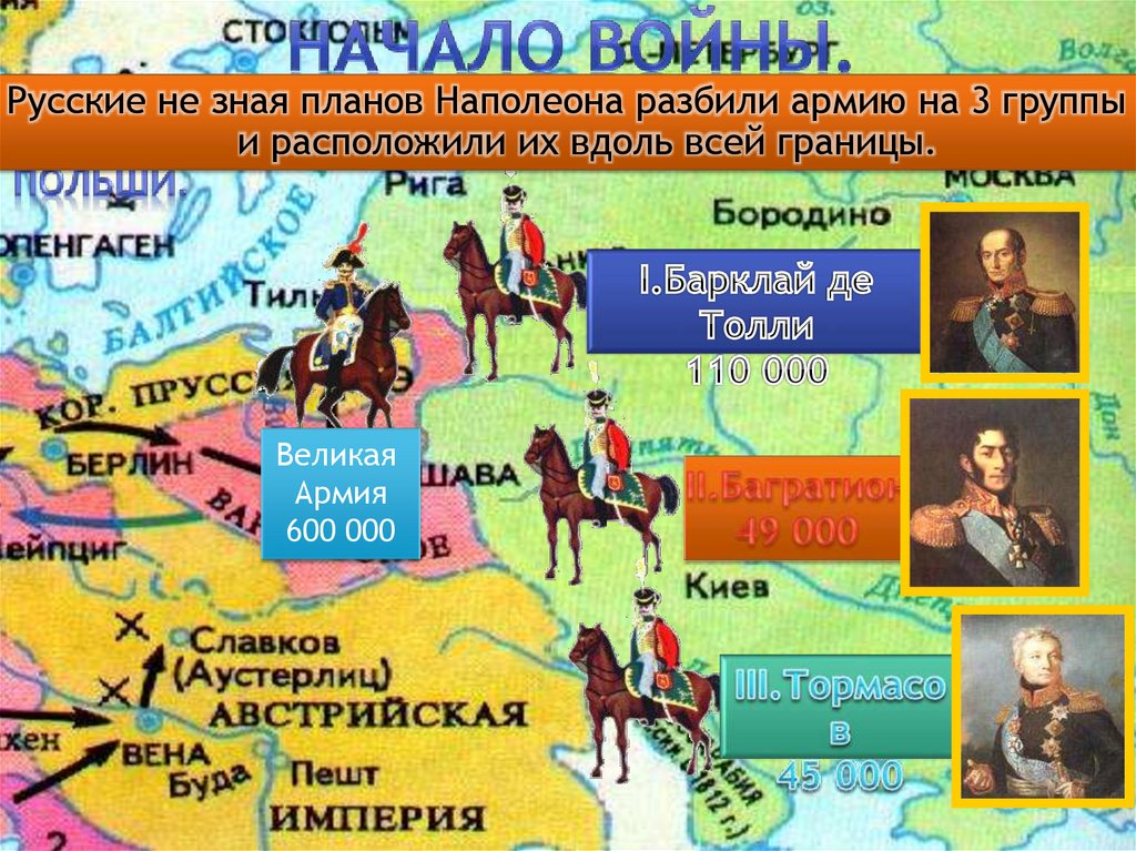 Русские не зная планов Наполеона разбили армию на 3 группыи расположили их вдоль всей границы.