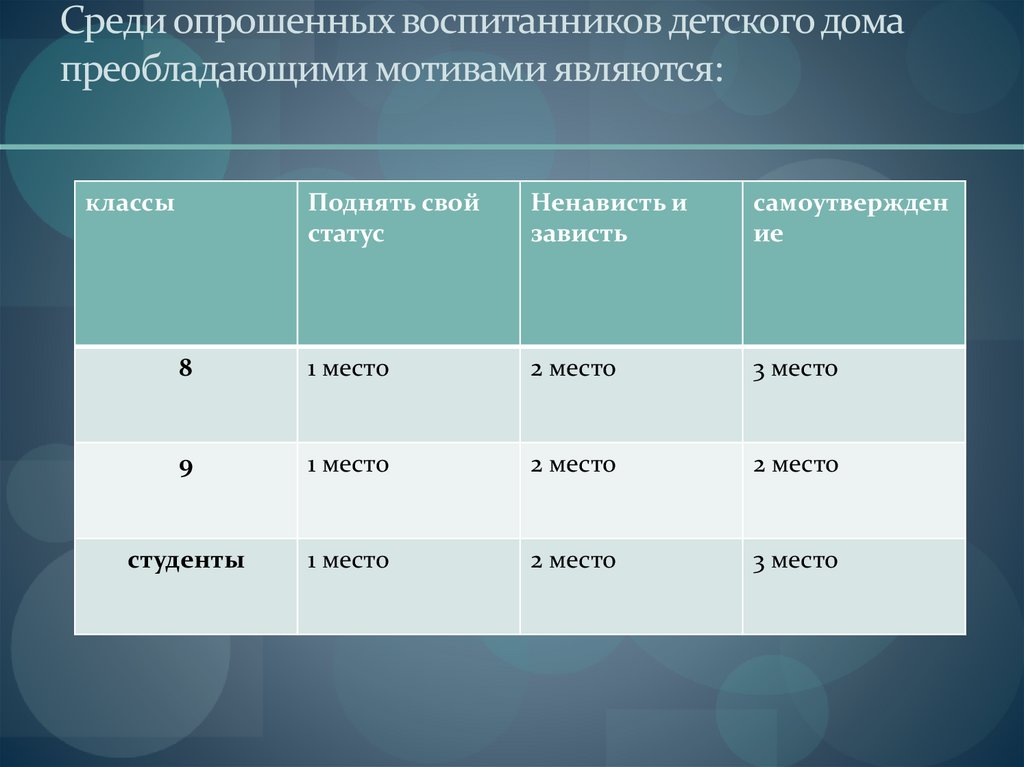 Среди опрошенных воспитанников детского домапреобладающими мотивами являются: