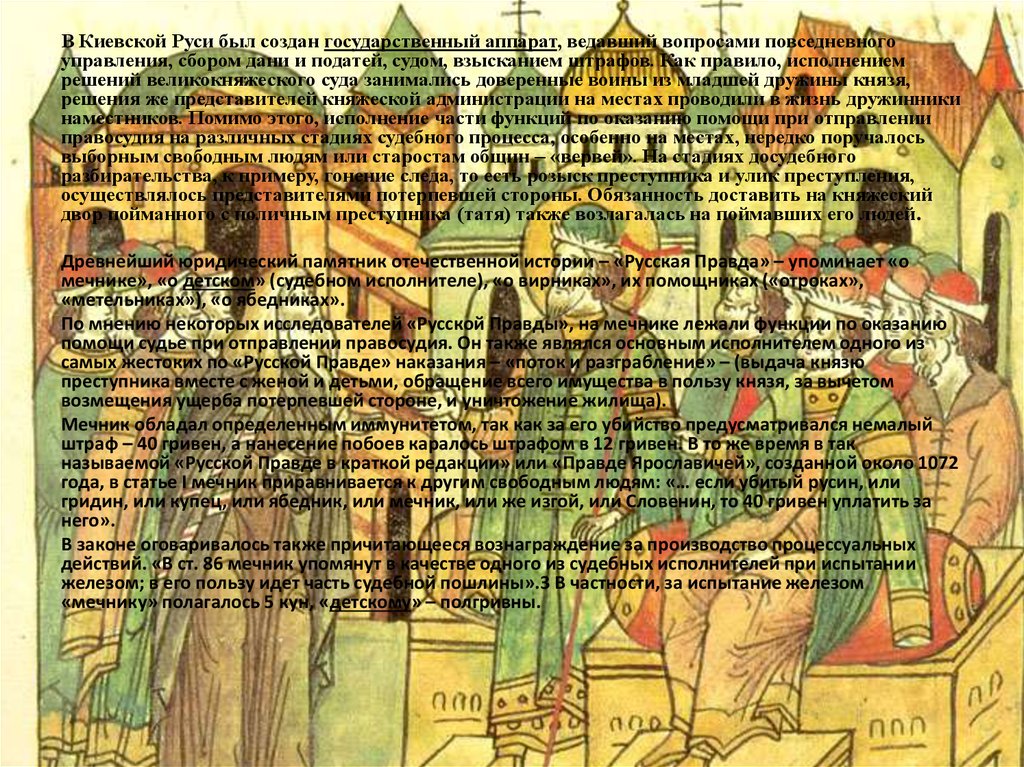 В Киевской Руси был создан государственный аппарат, ведавший вопросами повседневногоуправления, сбором дани и податей, судом, взысканием штрафов. Как правило, исполнением