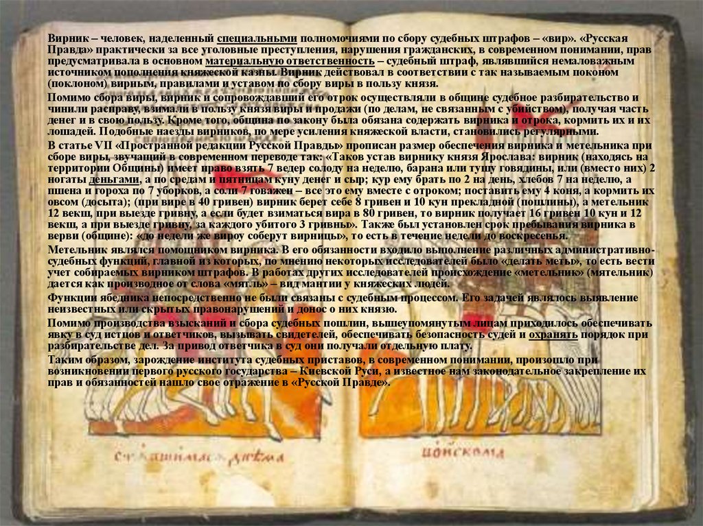Вирник – человек, наделенный специальными полномочиями по сбору судебных штрафов – «вир». «РусскаяПравда» практически за все уголовные преступления, нарушения гражданских, в современном понимании, прав