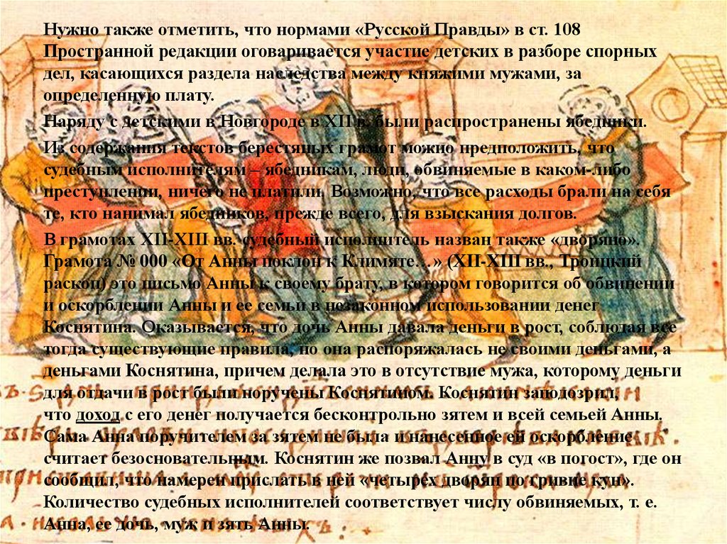 Нужно также отметить, что нормами «Русской Правды» в ст. 108Пространной редакции оговаривается участие детских в разборе спорных