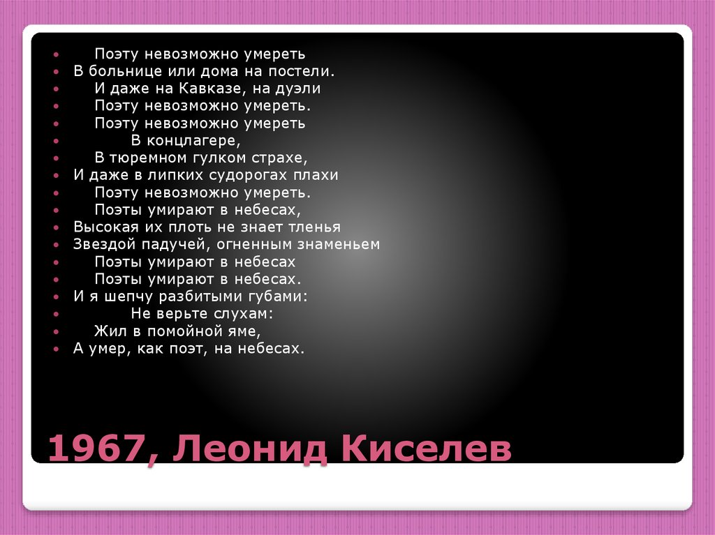 Поэту невозможно умеретьВ больнице или дома на постели.
